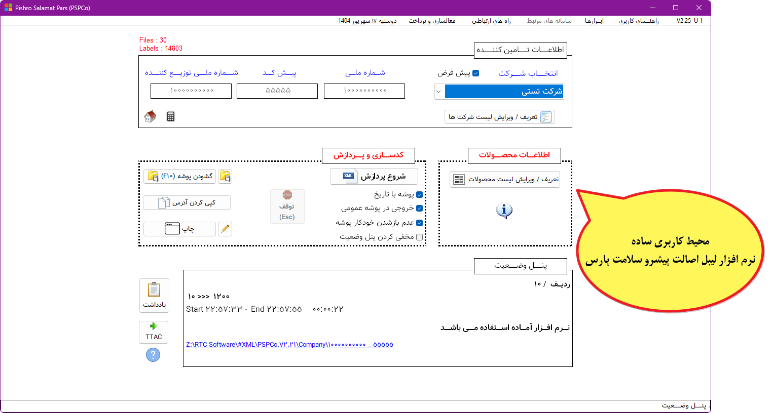 بله، روال کاری نرم افزار بسیار ساده و سریع می باشد. و نیاز به مهارت و دانش خاصی ندارد.در ابتدا اطلاعات شرکت و محصولات به نرم افزار معرفی می شود و هر وقت از محصولی تولید داشتیم تاریخ تولید و انقضا و بچ و تعداد را هم وارد میکنیم تا نرم افزار کدسازی نماید و نهایتا چاپ لیبل در انواع سایز ها و جزییات تعیین شده توسط خود کاربر انجام می پذیرد.